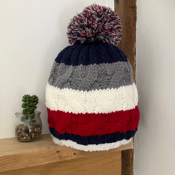 - Stripy hat in Navy, Red, White and Grey