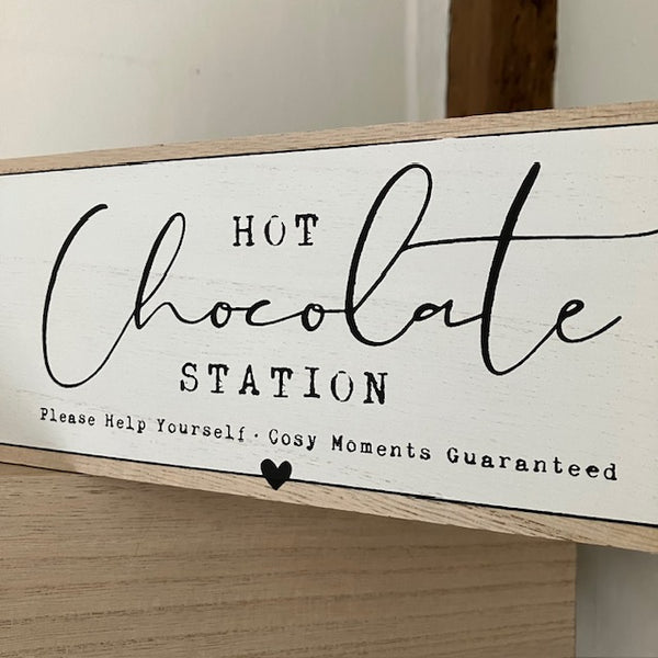 - Black chippy text reads: "Hot Chocolate Station, Please Help Yourself, Cosy Moments Guaranteed" with a little heart