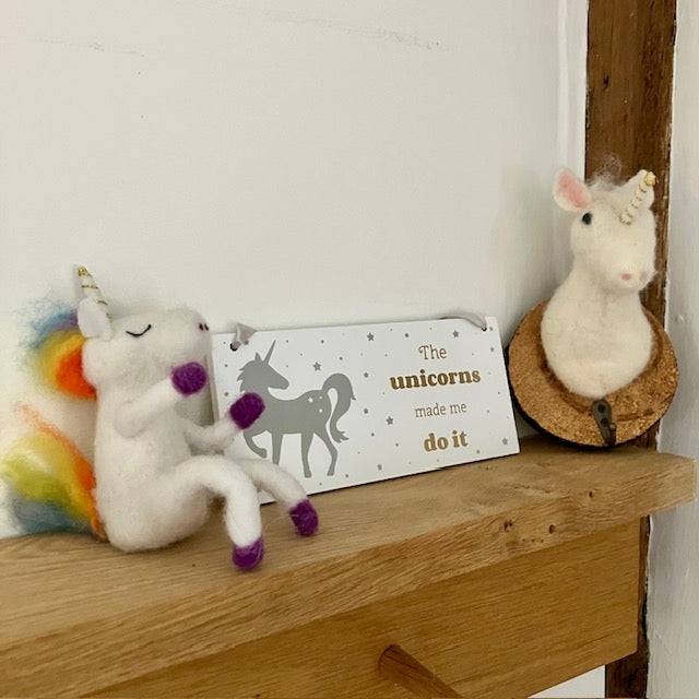 'The Unicorns Made Me Do It' sign is a fun gift for unicorn and horse loving fans