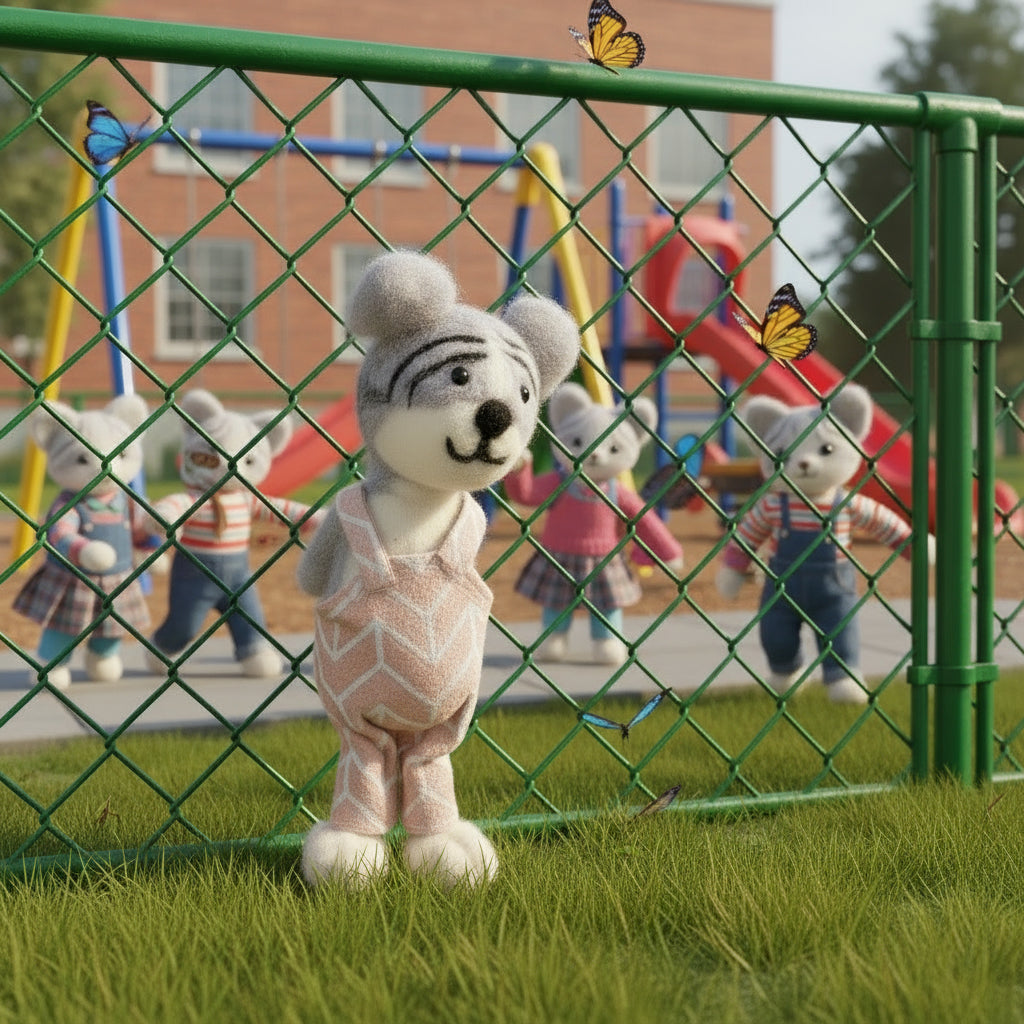 It was a very exciting day for Clementine Cat, for today she started Kitty School. As she looked through the gates of the school, Clementine felt something funny in her tummy, her Mum said it was "just butterflies". Clementine didn't recall having had any for breakfast? Just then another kitten came over "I like your dungarees" she said. "Thank you" said Clementine, rocking back and forth with her front paws behind her back. "My name is Clementine". "My name is Tabitha" said the friendly little kitten and all of a sudden those butterflies in Clementine's tummy seemed to fly away.